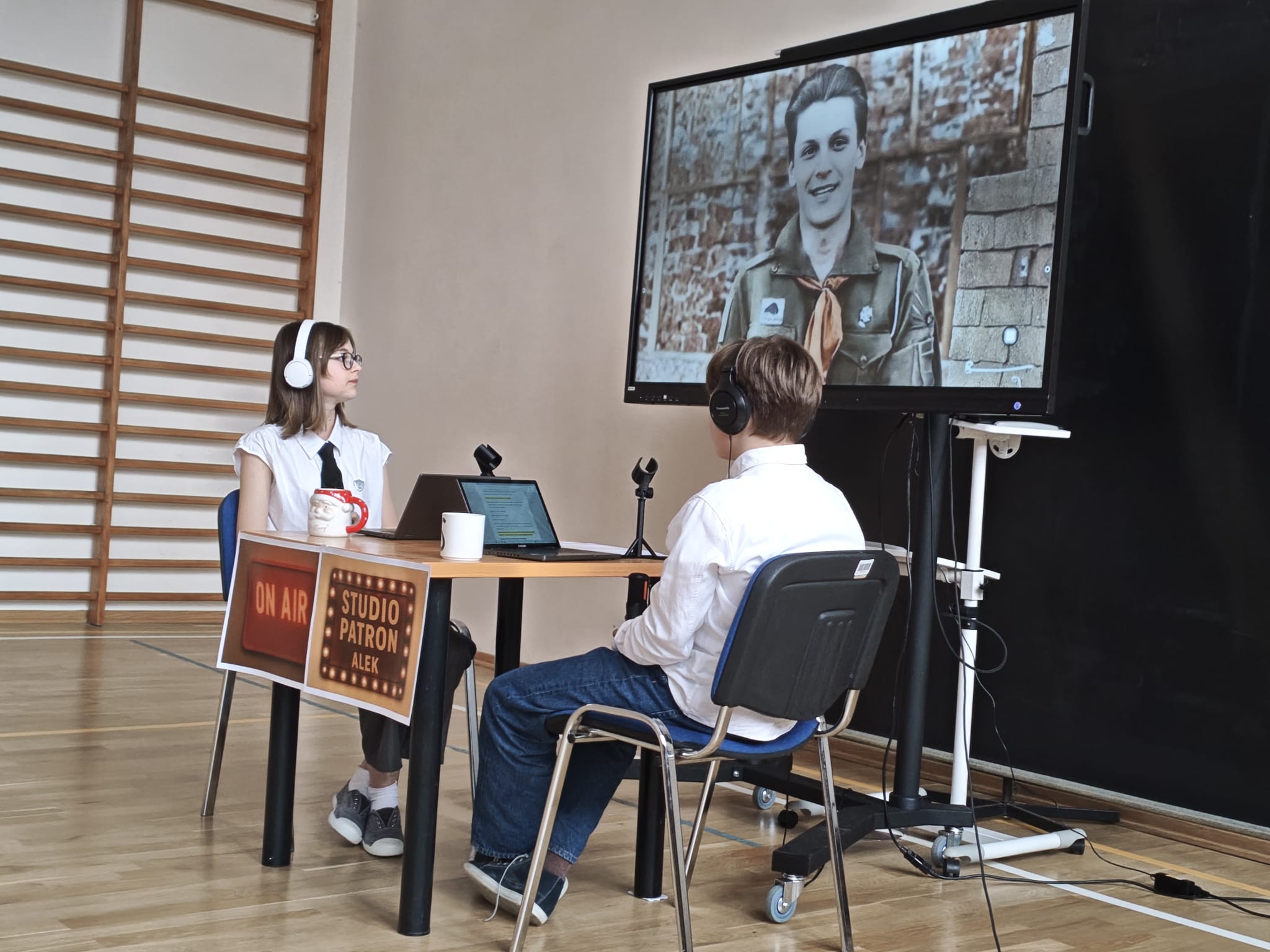 W tym roku, z okazji Dnia Patrona, zamiast tradycyjnego montażu słowno-muzycznego, społeczność naszej szkoły miała okazję uczestniczyć w niezwykłym wydarzeniu. Szkolni reporterzy – Kalina Żandarowska i Szymon Hołdys – zaprosili całą społeczność do studia podcastu „Studio Patron”, a ich gościem był sam patron naszej szkoły – Maciej Aleksy Dawidowski ps. „Alek”.