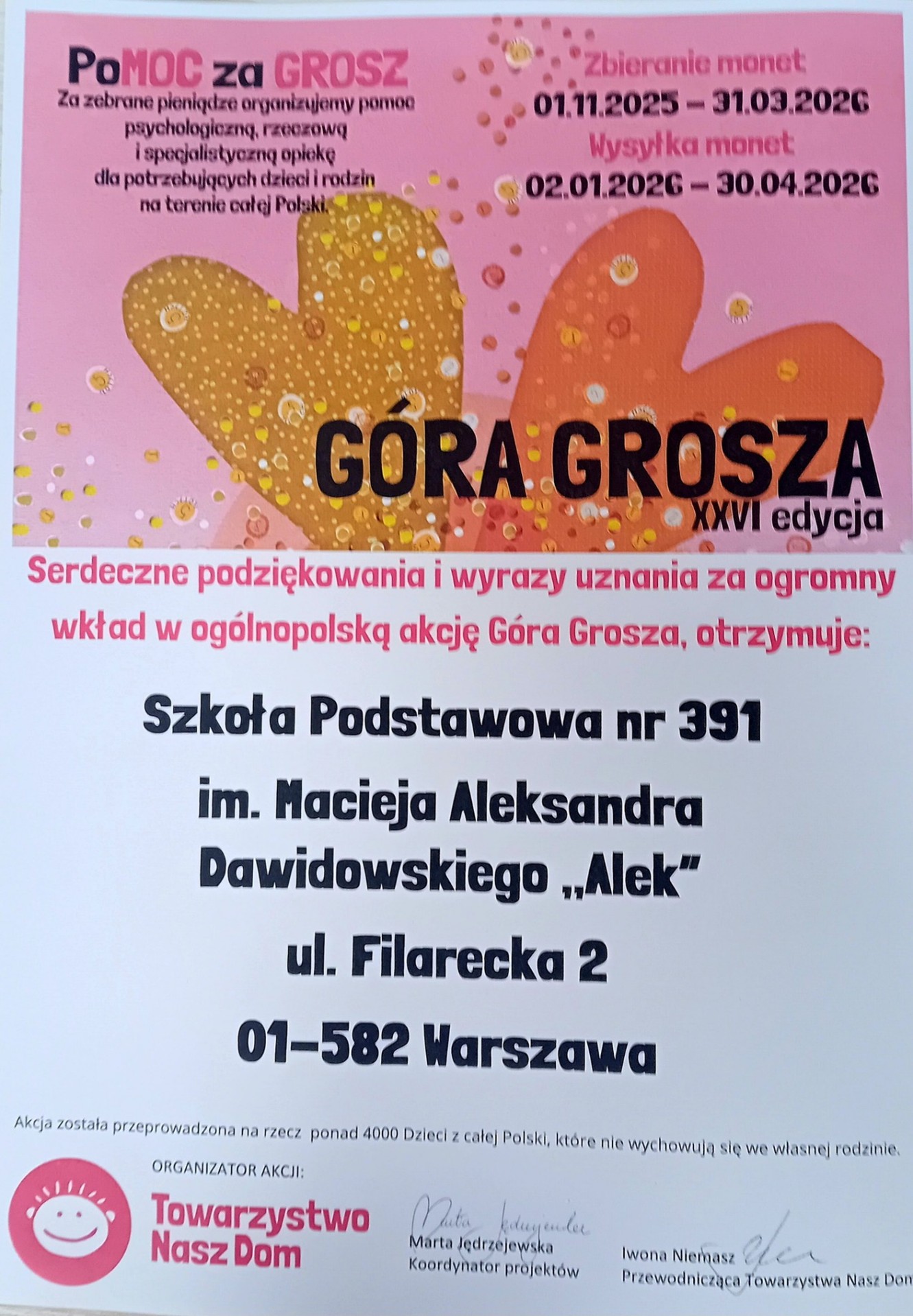 W naszej szkole zakończyła się tegoroczna edycja ogólnopolskiej akcji „Góra Grosza”, organizowanej przez Towarzystwo „Nasz Dom”. Celem przedsięwzięcia jest zbiórka jak największej ilości groszy oraz uwrażliwianie dzieci i młodzieży na potrzeby innych. Zebrane środki przeznaczane są na pomoc dzieciom wychowującym się poza własną rodziną, w szczególności na wsparcie rodzin zastępczych, rodzinnych domów dziecka oraz placówek opiekuńczo-wychowawczych.